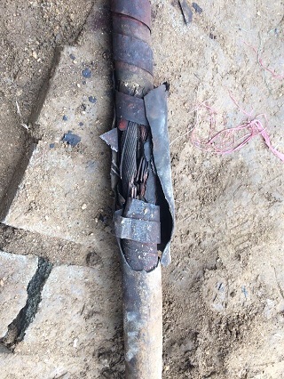 3、用低壓脈沖測試,電纜全長為162米。相間對比在18米左右波形不匹配。用脈沖電流測距,紅相對零線,電壓5KV擊穿,波形顯示故障在距測試端18.7米左右,在配電室南面的綠化帶定位,聽到放電聲。